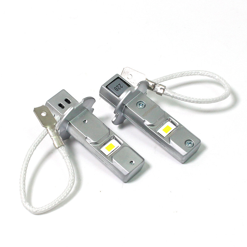 High quality LED upgrade with aluminium heatsink for H3 lamps with the PK22S base. A PAIR of V30 series lamp with CSP 3570 LEDs, 4500LM luminous flux. Replaces a standard H3 bulb in the same size envelope. Flexible application - 11 to 48V DC input, allowing 12V and 24V application. NEGATIVE EARTH ONLY! One high power LED array on each side of the lamp body. In testing, these lamps proved brighter than 12V B453 (55W) when installed in a lamp, with a classic white look. SOLD AS A PAIR Very low current draw - less than 40% of 55w halogen bulbs (2.0A +/-0.3A at 12V), so great for low powered electrical systems. 4300K classic white colour temperature. Plug and play upgrade for H3 bulbs. Powerful, high performance lighting with reduced current consumption in a compact package. This high performance LED is a great upgrade alternative to a number of halogen bulbs including B453. Premium construction from aviation grade aluminium. Total LED height 41mm. One 6.3mm spade connection on a 100mm long coated wire tail. A great LED upgrade for 978 style Fog, Reversing and Indicator lamps.