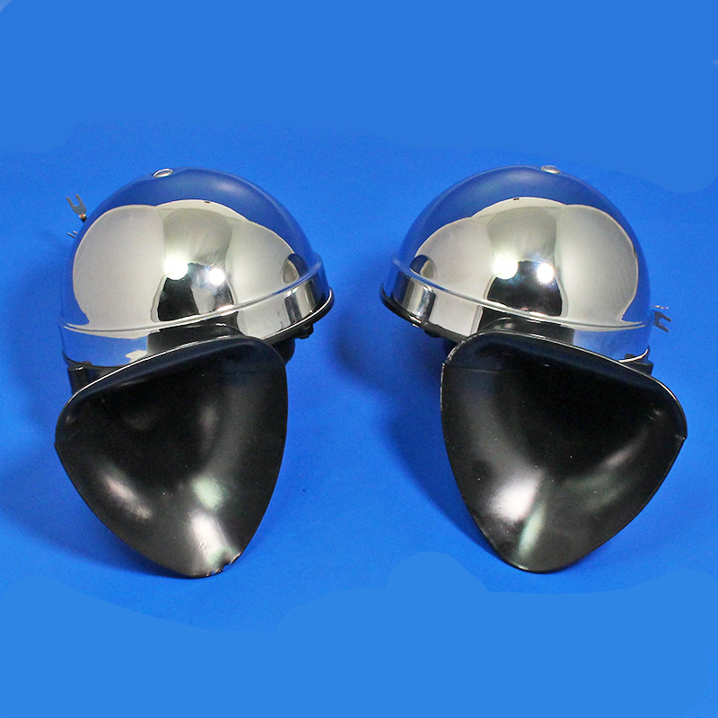 Large 12-volt electric horn with chrome cover fitted with chrome on brass 'Toby' medallion in the centre and stainless steel domed nuts around the edge of the cover, in the style of the 'Altette' horn. Very loud. Approximately 150mm diameter x 90mm deep (front to back), weight 1.2kg. Black mounting arm supplied. Spade connector terminals.