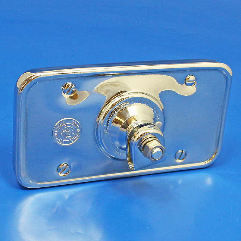 Rectangular, arm mounting mirror, stamped Desmo. Size 118mm x 67mm, fitted with a clamp for 3/8" (10mm) arm. All brass construction, available with polished brass, chromium or nickel plated finish, as well as either flat or convex glass. Please select your preferred configuration from the options below. Handmade in Britain. -- convex glass