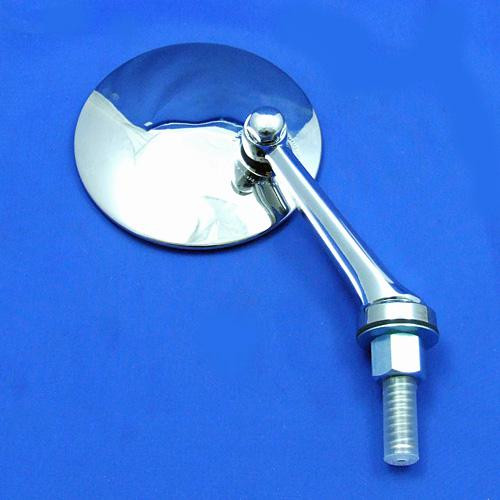 Round mirror with long, curved mounting arm. 4" circular polished stainless steel mirror head with 140mm long curved chrome arm. Adjustable mounting bracket. For mounting on the left or right hand side of the vehicle. Fitted with flat glass