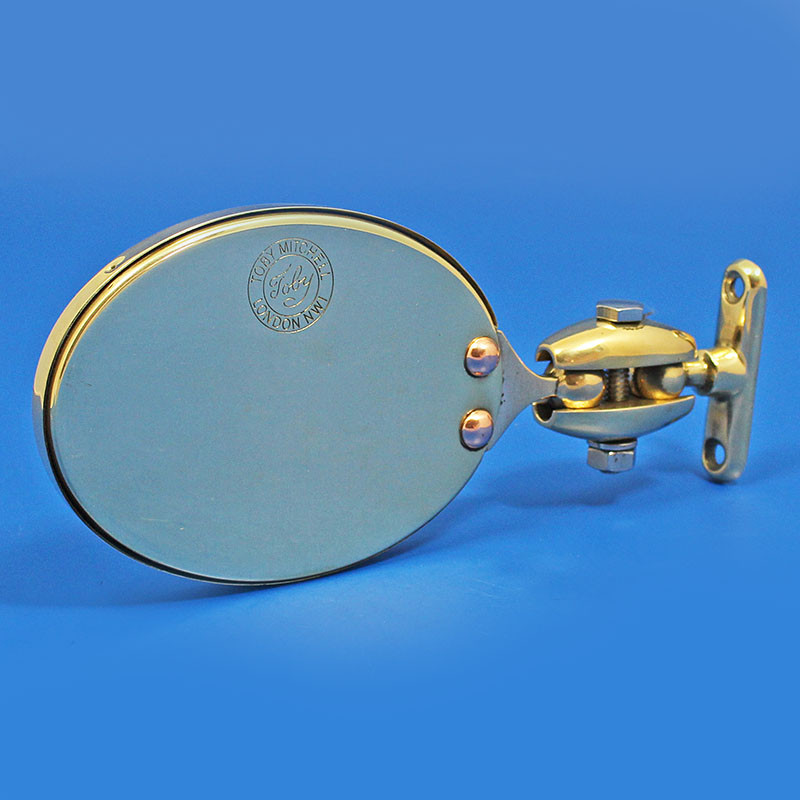 Oval-type CONVEX glass mirror suitable for vehicles of the '30's. Stamped TOBY, with the mounting bracket on the long side of the oval. Head size 110mm tall x 82mm wide, overall length 153mm. Complete with concave base mounting bracket 58mm x 14mm, hole centres 43mm approx. Our own manufacture, all brass and bronze British construction, reproduced from an original 'Desmo' pattern. Although these were originally made for right-hand mounting on the vehicle, we do offer left-hand mounting if specified. -- Polished Brass, tall oval-shaped mirror