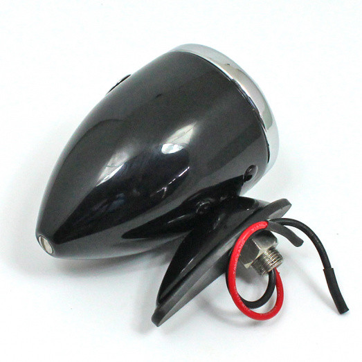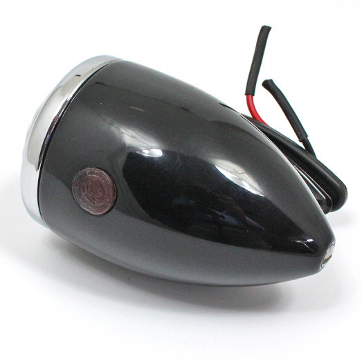 Vintage 'Toby' side lamp equivalent to Lucas part number 1142. Originally fitted to many quality cars including Rolls-Royce and Bentley. All brass construction with gloss BLACK powder coated finish to lamp body and plinth, with a CHROME rim. Converted bulb holder arrangement to provide indicator and side lamp functionality (as our 424A bulb holder conversion for the 1130). Takes WEDGE T10 base capless bulbs - part numbers B501 and B921A (12V only), supplied. Upgrade to LED functionality with lamp kit 424ALEDBK and and electronic flasher unit LEDFLASH3. Rim and lens arrangement as original lamp.
