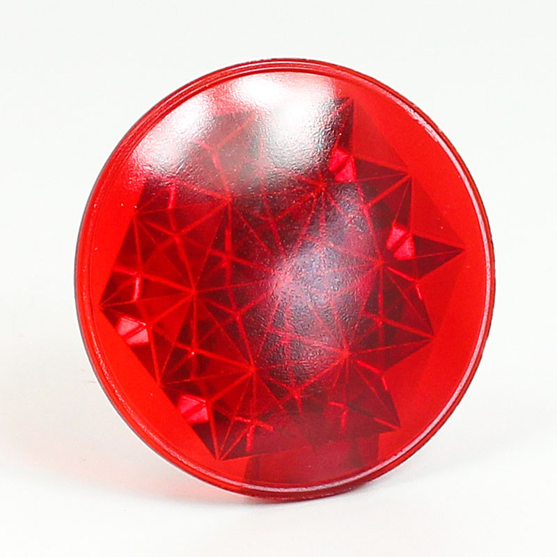 Very high quality backlight crystal glass round reflector lens, manufactured in transparent deep red glass, 54mm diameter with 1mm recess around the edge which is 2.2mm thick, total thickness 9.2mm. Smooth front face, rear has a multi faceted surface.