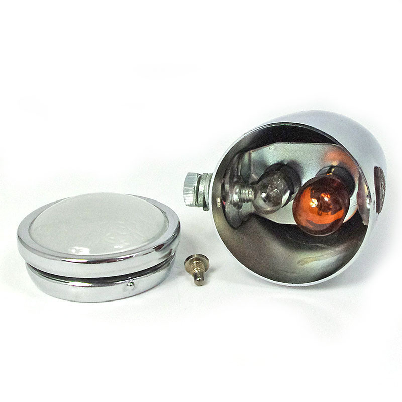 The internals of this lamp have been modified to accept two individual capless bulbs with the WEDGE T10 base - a clear 5W side lamp and an amber 21W indicator lamp. 12 Volt incandescent bulbs available only.