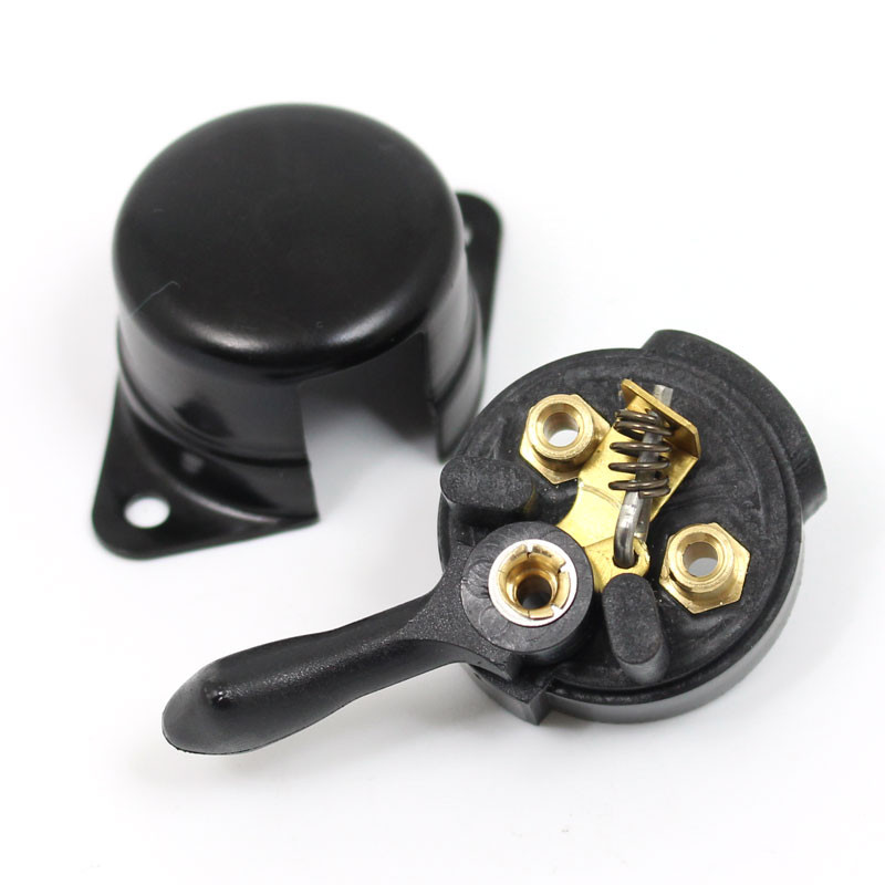 Compact two position switch suitable for dash mounting. A quality reproduction switch equivalent to Lucas part number 9RW (380417) originally offered with a plain black cover (or with a cover marked with an 'ON' position - Lucas part number 31291). The brass cover over the switch mechanism incorporates two 3mm diameter mounting holes at 35mm centres. A very neat period switch originally used to control fog and spot lamps, dipping reflectors and reversing lamps. Solder sockets on rear for wiring connection.