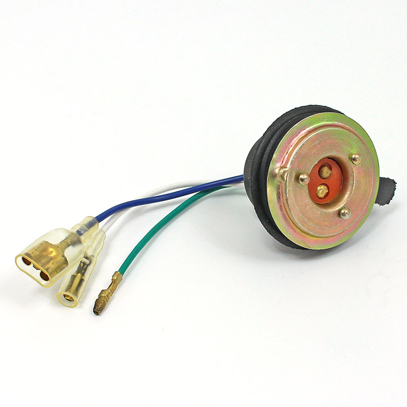 Double contact bulb holder for American Pre-Focus P15D 30 double contact base bulbs. Removeable rubber boot surround. Metal holder front plate maximum 44.5mm diameter with three spring loaded studs that locate and twist into the slot holes in the focus plate on the bulb base. One raised locating notch on outer face plate. 16.5mm outer diameter metal holder/socket with 15.5mm inner diameter. Two live connection leads and one earth - Green, earth (bullet connection); White, low beam (socket connection); Blue, high beam (spade connection).