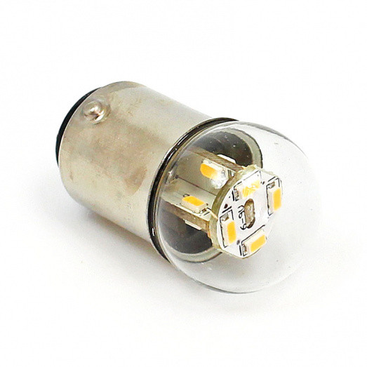 12 x 3014 SMD LED BA15D 6 Volt multi-directional warm white lamp. Dual brightness LED bulb with 6 to 9v input voltage range. BA15D double contact base. Clear glass 19mm diameter LED cover. Compatible with either negative or positive earth systems. Very low current draw - over 75% less than incandescent and halogen bulbs so great for low powered electrical systems. 3000K warm, white colour temperature. A really neat bulb for vintage and classic vehicles - LED performance with the look of a conventional bulb. Wire the preferred brightness.