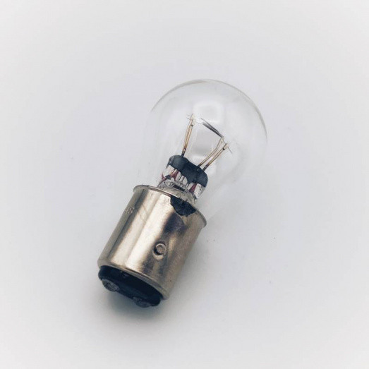 12V bulb rated at 24/6W, BAY15D offset pin double contact base, 25mm globe diameter. Double transverse filament. Brighter alternative to B380.