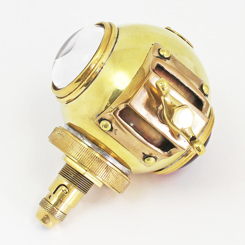 Toby 'diver's helmet' small tail lamp. 48mm diameter mains glass bulls eye lens, 42mm diameter glass bulls eye side lenses. Overall lamp diameter about 80mm. Similar to the old CAV, Rotax and Lucas models. Sold in pairs.