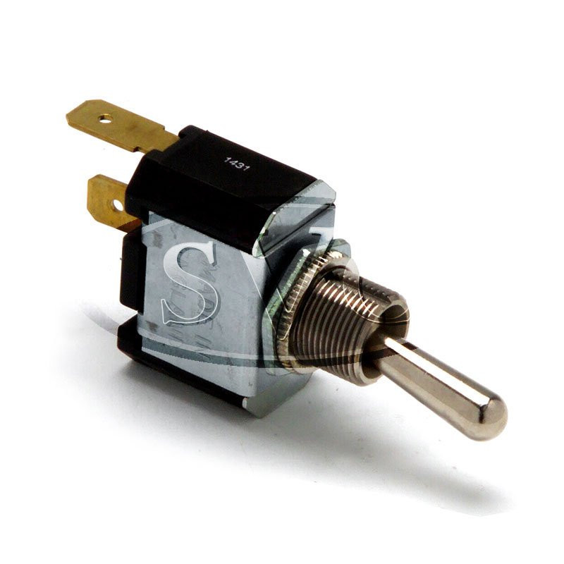 Toggle switch, on/off only, requires hole through metal panel 13mm. Nickel plated toggle lever, Lucar type 6.3mm spade terminals.