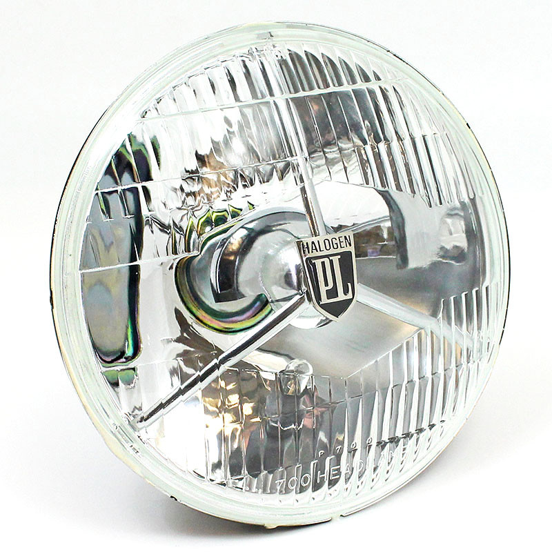 A PAIR of PL700 design light units. RHD 7" reflector units WITH side lights. A quality reproduction of the PL700 type unit with tripod design featuring a 'Halogen PL' 'Shield' badge - takes the popular H4 halogen bulb.